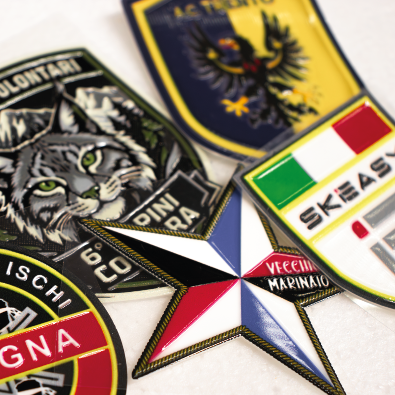 Offrono rilievo tridimensionale, effetto gomma lucido, alta definizione e possibilità di texture o zigrinature su parti del logo, rendendo il risultato visivamente molto distintivo.